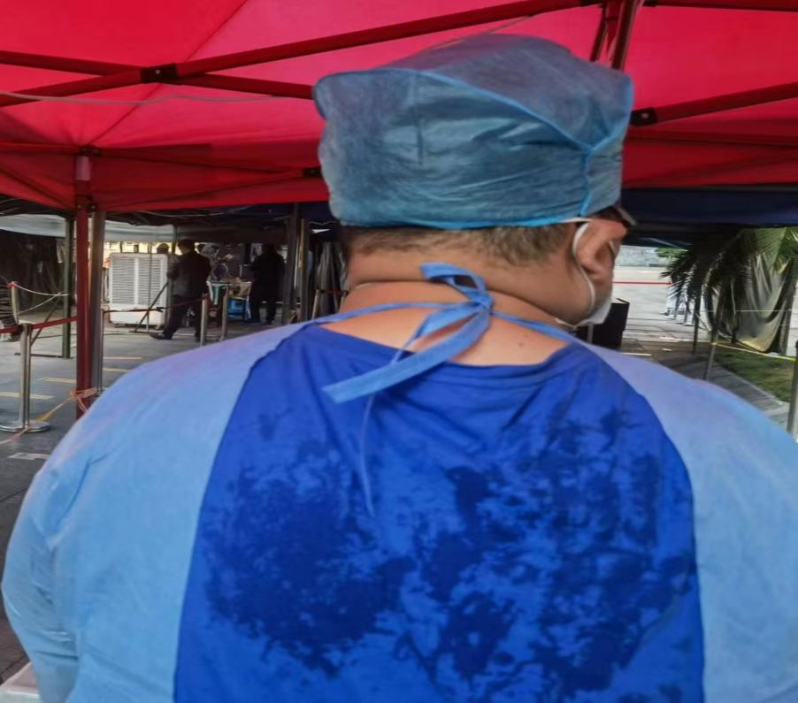 正值酷暑,凯里市的天气烈日炎炎,谢思杰因为自身体质原因,同时穿着密闭的隔离服装,带着紧绷的的N95口罩和厚厚的橡胶手套,毒辣的阳光照在他的身上,他挥汗如雨,汗流夹背,面部已被N95口罩勒出红红的深印。即使如此,他仍任劳任怨,吃苦耐劳,发扬牛劲,认真完成志愿者的工作,服务好每一个前来做核酸的群众百姓。