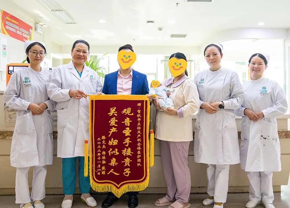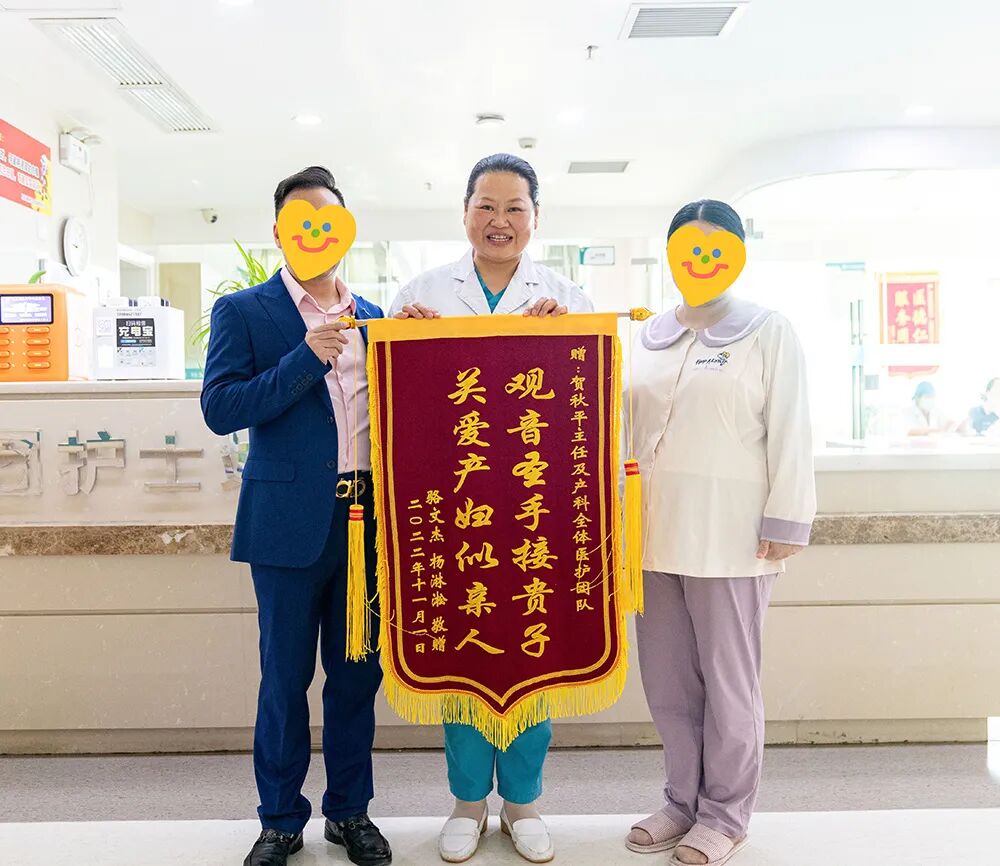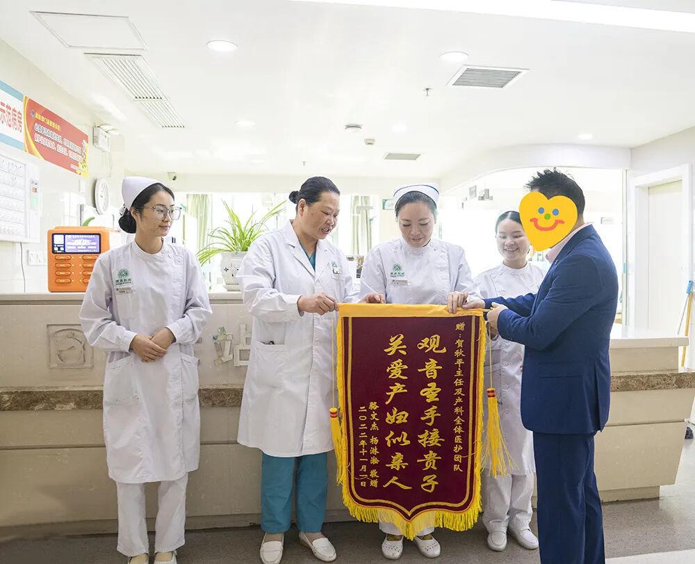 姓名:杨女士 情况:孕38+4周LOA单活胎待产、瘢痕子宫、脐带绕颈 手术医生:贺秋平 助手医生:高敏  11月7日上午杨女士抱着自己刚出生几天的宝宝和爱人一起将一面红底金字的锦旗赠送给我院产科贺秋平医师及产科全体医护工作人员,“观音圣手接贵子,关爱产妇似亲人”14个醒目的大字表达了对我院产科医护人员的感激、信任与认可。