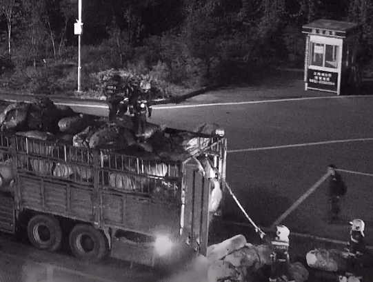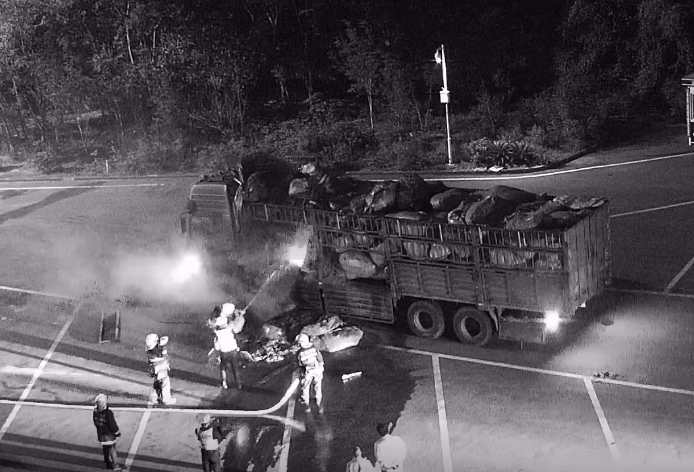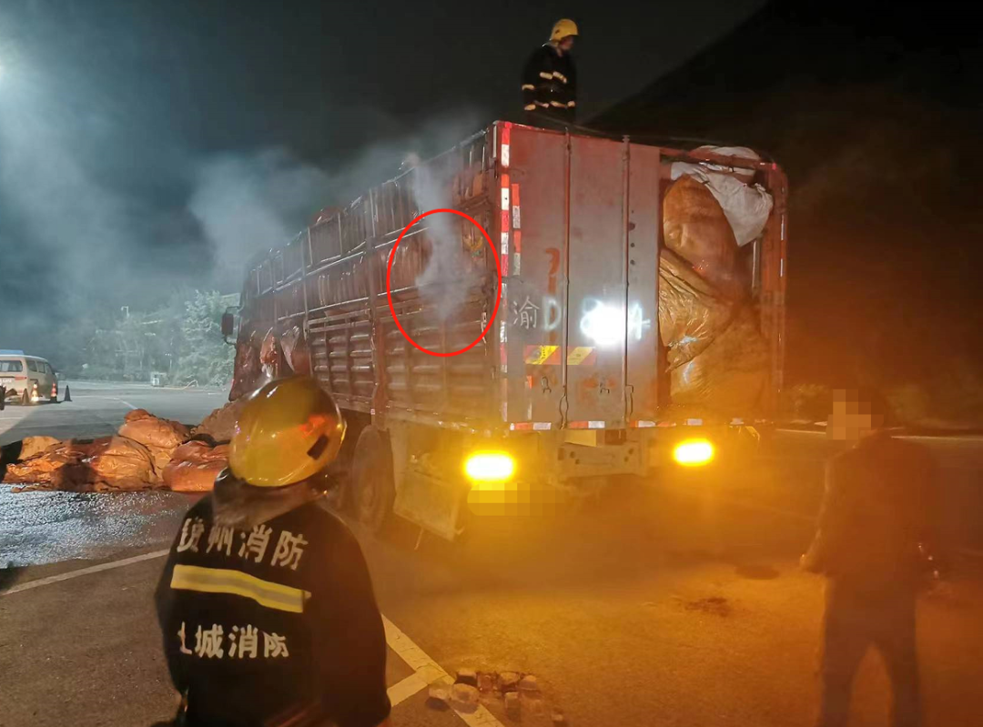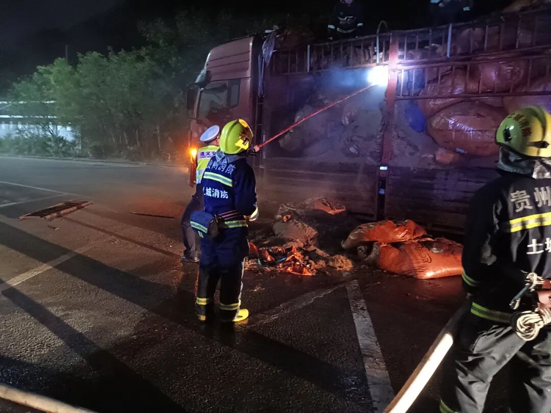 当日晚22时35分,驾驶员裴某某驾驶重型仓栅式货车行驶至遵义市习水县土城停车区时,发现货厢有浓烟冒出,于是下车对车厢进行检查,发现装满椰糠的车厢内有些许火苗正在燃烧,裴某某找了一根水管进行灭火,因水量太小,加之椰糠外部有塑料编织袋保护,无法扑灭火源,于是报警求助。接警后,遵义市公安交通管理局遵赤高速公路交警大队民警立刻联系就近消防队一同赶赴现场进行救援。为防止险情进一步恶化,民警迅速设置好安全防护措施,一边安排人员对事故后方车辆进行分流、引导,一边与消防人员对起火车辆进行扑救。
