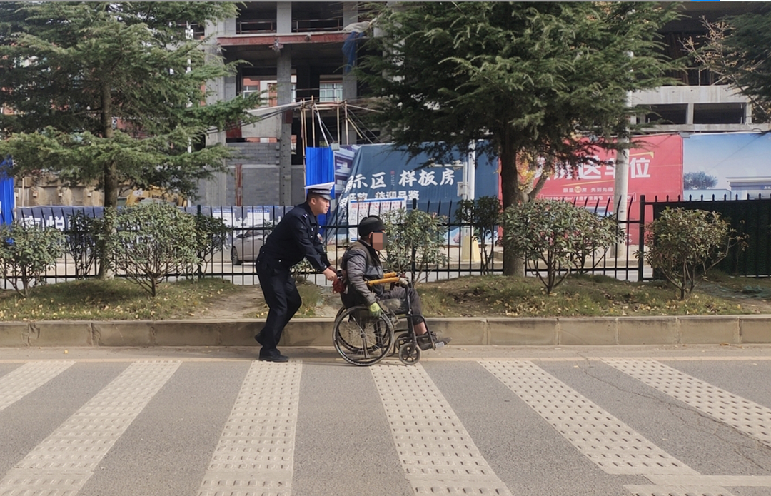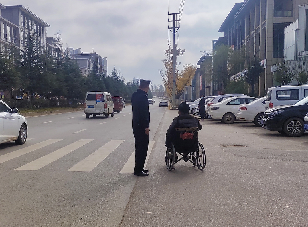 11月6日10时许,毕节市威宁县公安局交警大队十中队执勤交警巡逻至滨海大道贵州工贸职业学院附近时,看见一位老年人坐在轮椅上,用手推行轮椅在机动车道上前行。