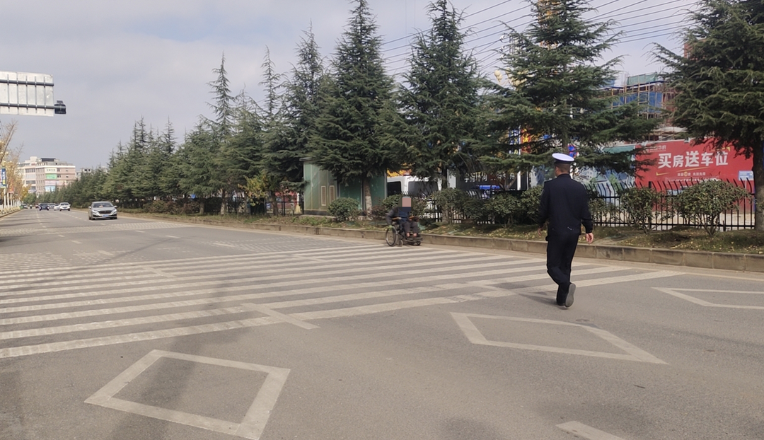 民警立刻来到老人身边告诉他:“您行走在机动车道上太危险了,我带您离开吧。”就这样,一位民警指挥交通,一位民警将老人推至人行道内。
