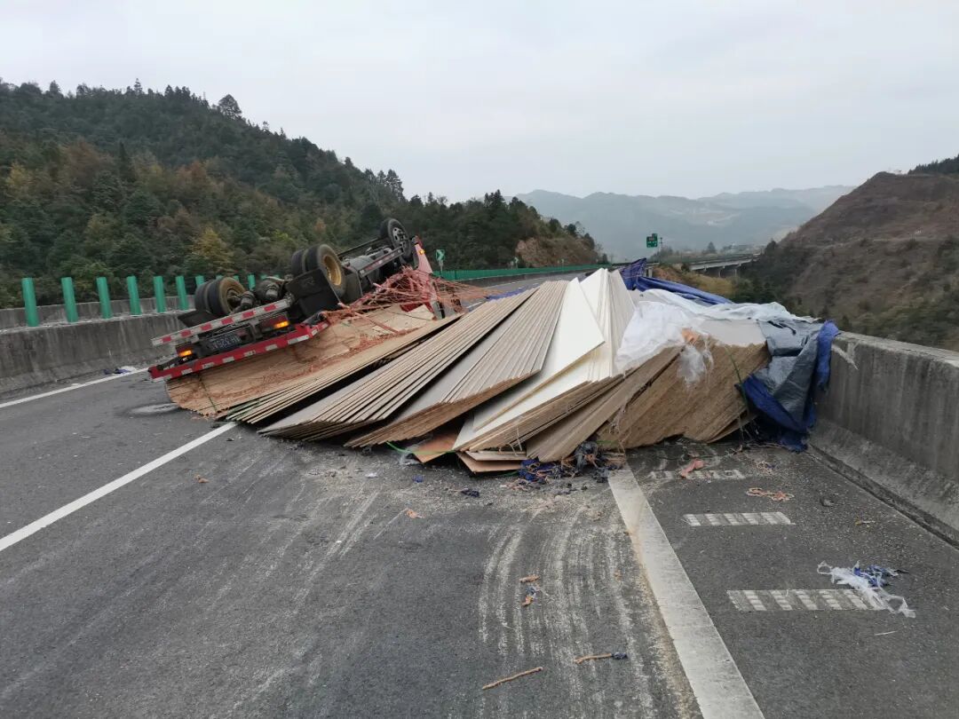 11月13日,松从高速一辆货车发生交通事故,车辆侧翻占用行车道及超车道上,所幸车乘人员都系好安全带,现场无人员受伤。