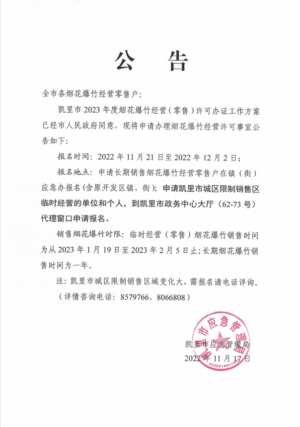 凯里市2023年度烟花爆竹经营(零售)许可办证工作方案已经市人民政府同意,现将申请办理烟花爆竹经营许可事宜公告如下: