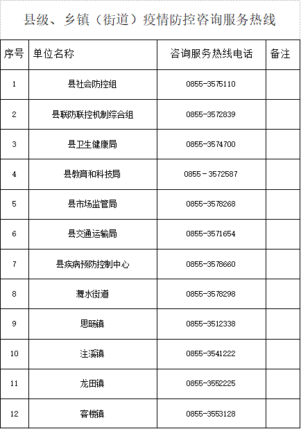 0855-3615520(县社会防控组),0855-3698140(县联防联控机制综合组);0855-3611534(县交通局)。