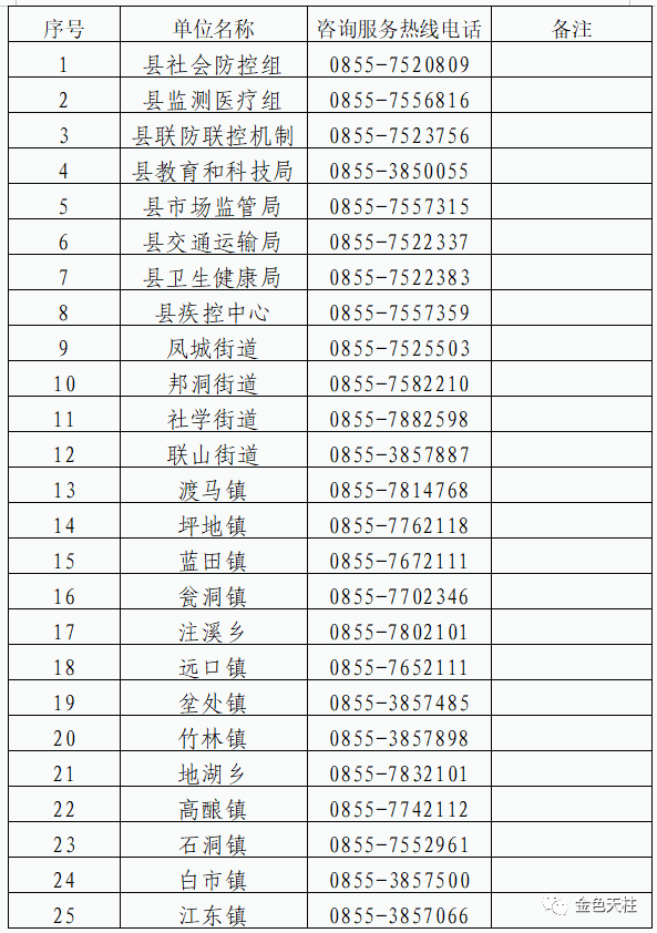 0855-3337026(县社会防控组);0855-3333768(县联防联控机制综合组);0855-3331327(县交通局)。