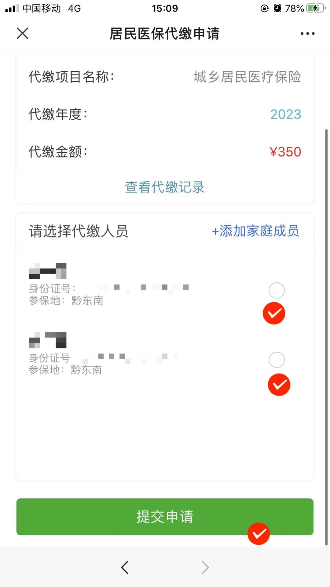 第六步:点击选中“需代缴的家庭成员并提交申请即可;
