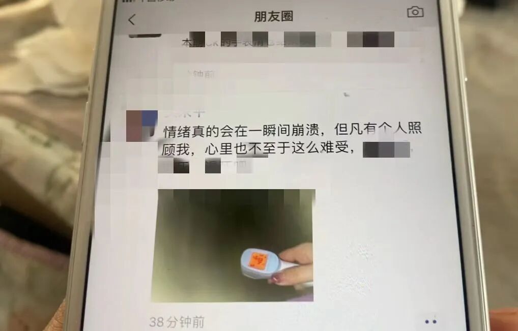 “情绪真的会在一瞬间崩溃,但凡有个人照顾我,心里也不至于这么难受......”12月18日凌晨,正在刷朋友圈的袁光容突然看到了李茜发在圈里的这句话,还配上了一张体温计的照片,直觉告诉她,对方应该是身体出了状况。
