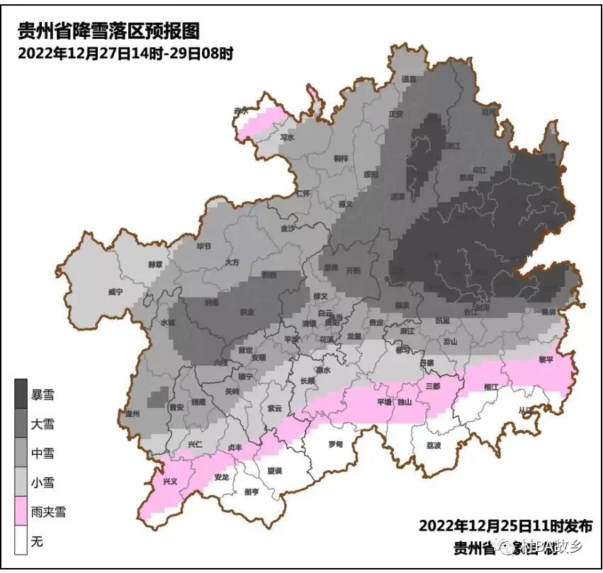 据贵州省气象台预报, 受强冷空气影响,27日下午开始至28日,除南部地区外,全省自北向南逐渐由雨转为雨夹雪或小到中雪,省的东西向中部一线有大雪,局地暴雪,地势高处有道路结冰;各地气温下降,大部分地区最低气温将降至0℃及以下。29日大范围降雪天气趋于结束,但大部分地区低温阴雨天气将持续至岁末,且局部地区伴有冻雨或雨夹雪。