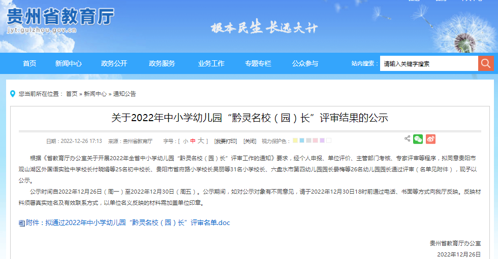 ​近日,2022年全省中小学幼儿园“黔灵名校(园)长”评审工作已结束,经个人申报、单位评价、主管部门考核、专家评审等程序,拟同意贵阳市观山湖区外国语实验中学校长付晓娟等25名初中校长、贵阳市省府路小学校长吴丽等31名小学校长、六盘水市第四幼儿园园长晏梅等26名幼儿园园长通过评审,现予以公示。