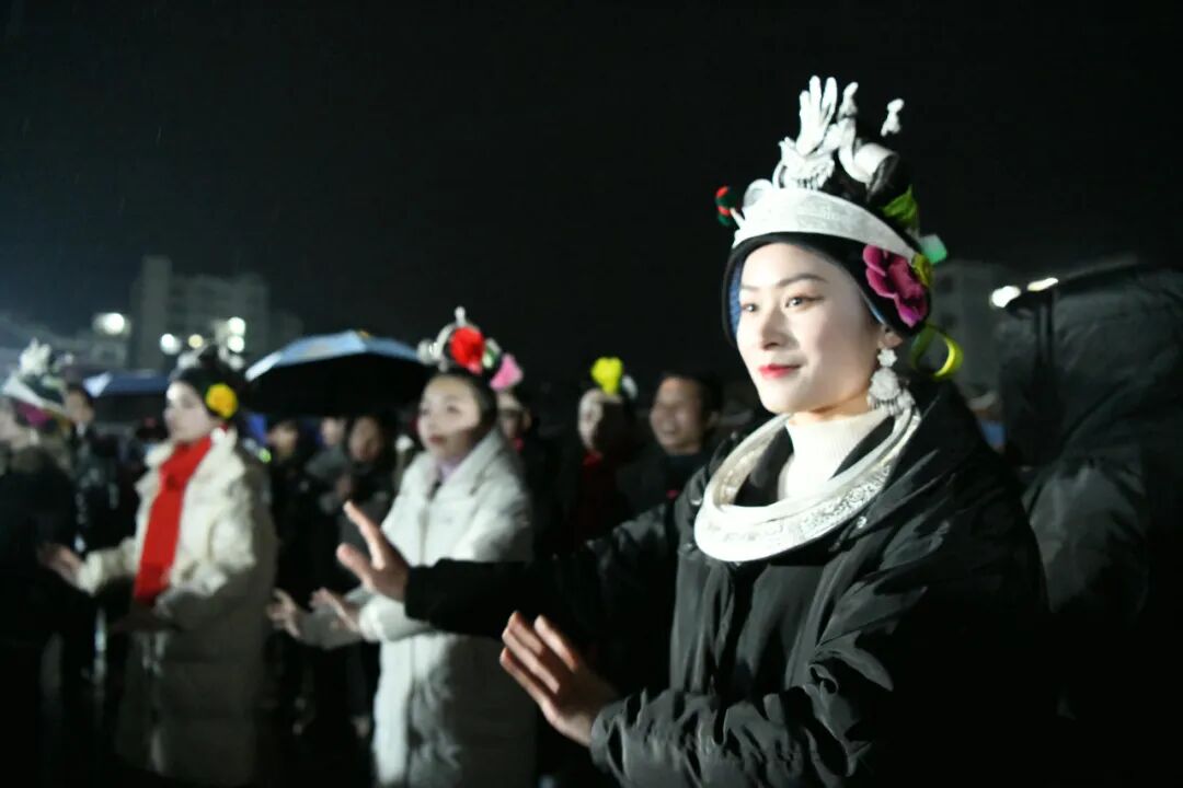 随后芦笙队开始吹奏芦笙,鞭炮声响彻连天,烟花照亮了漆黑的夜空,姑娘们踏着芦笙曲和鞭炮声在芦笙堂跳起了芦笙。苗家姑娘们笑脸盈盈,随着芦笙吹奏乐曲的变化轻轻舞动,身上佩戴的银饰发出悦耳的声响,别有一番风情。来自各个村寨的老老少少和闻讯而来的游人将现场围得水泄不通,大家纷纷用手中的相机、手机记录下这精彩时刻。