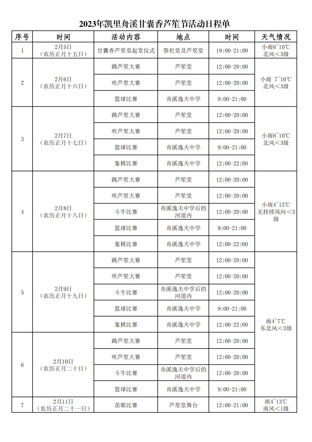 芦笙节一直举行到正月二十一方才结束,有跳芦笙、斗牛、苗歌、篮球、象棋等民俗文化活动,颇为热闹。  甘囊香芦笙节渊源 苗族始祖蚩尤在与炎黄二帝的战争失败后,苗族被迫开始千年的漫漫西迁路。其中迁徙到舟溪的吴氏迷公在“养郜灵”下面建立鼓和芦笙坪,作为苗族男女社交娱乐的活动场所,后被朝廷破坏和禁止。为让地方青年人有社交场所,舟溪吴氏先祖决定在屯上村下面宽平的河沙滩建新芦笙堂,称为甘囊香芦笙堂。芦笙节恢复当日,盛况空前,方圆百里的苗族群众身着盛装兴高采烈地参加了芦笙歌舞比赛、斗牛、赛马、游方等活动。自吴氏先祖告乜主持芦笙节以来,舟溪年年风调雨顺、六畜兴旺。告乜离世后,群众便推举告乜的直系裔孙主持每年的芦笙节,告奖、告累、告岛的裔孙协办,如此沿袭至今已有数百年。 来源:心动930