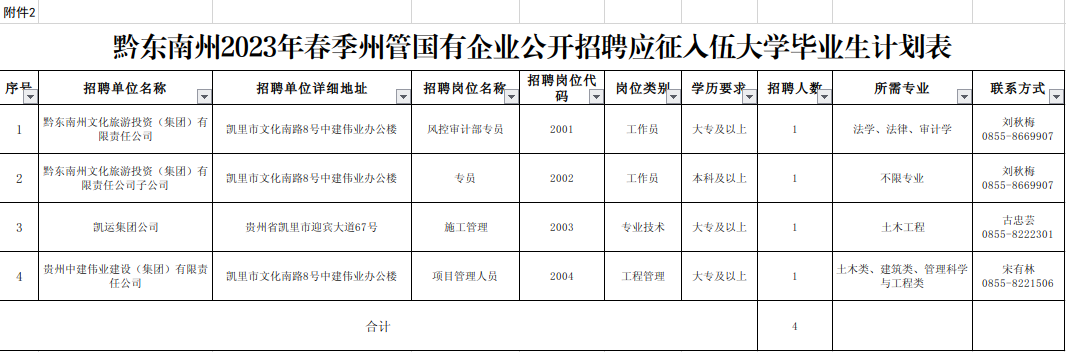 结合2023年度春季黔东南州征集大学毕业生入伍任务,州人力资源社会保障局会同州委编办、州人民政府征兵办公室、州国资委计划春季公开招聘应征入伍优秀大学毕业生44名,其中事业单位招聘40名,州直相关企业招聘4名。具体名额见《黔东南州2023年春季事业单位公开招聘应征入伍大学毕业生计划表》(附件1)和《黔东南州2023年春季州管国有企业公开招聘应征入伍大学毕业生计划表》(附件2)。