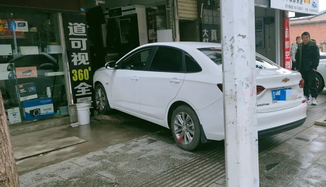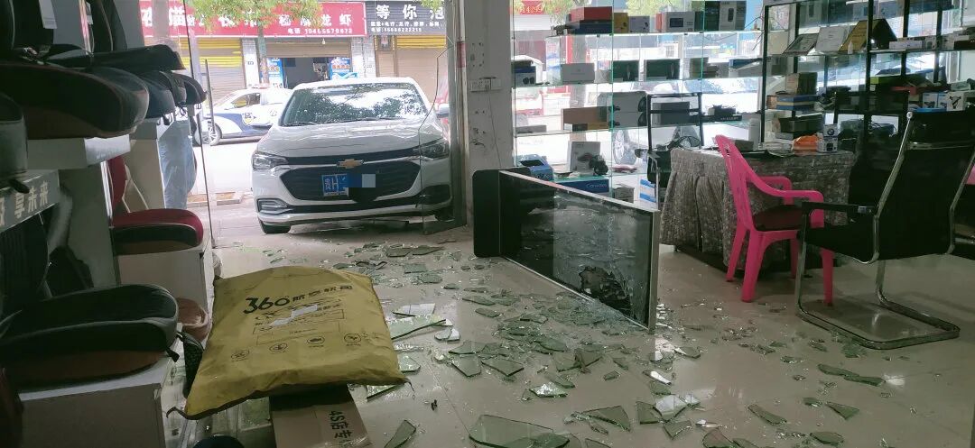 接警后,值班民警立即赶往现场,只见一辆白色雪佛兰牌小轿车停在一家汽车美容装饰店内,左侧车轮卡在墙上,店内满是被撞破的玻璃门碎片,一台广告投放机也被撞倒在地,车辆受损较轻。
