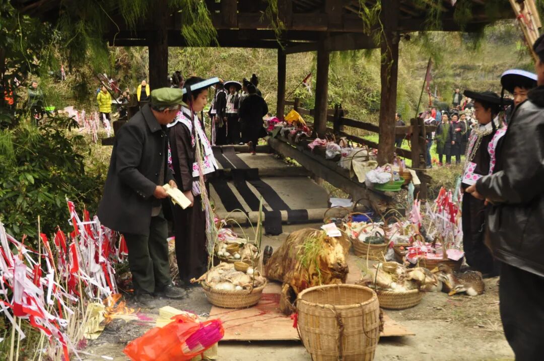 寨佬正在进行祭桥仪式 杀牛祭祀