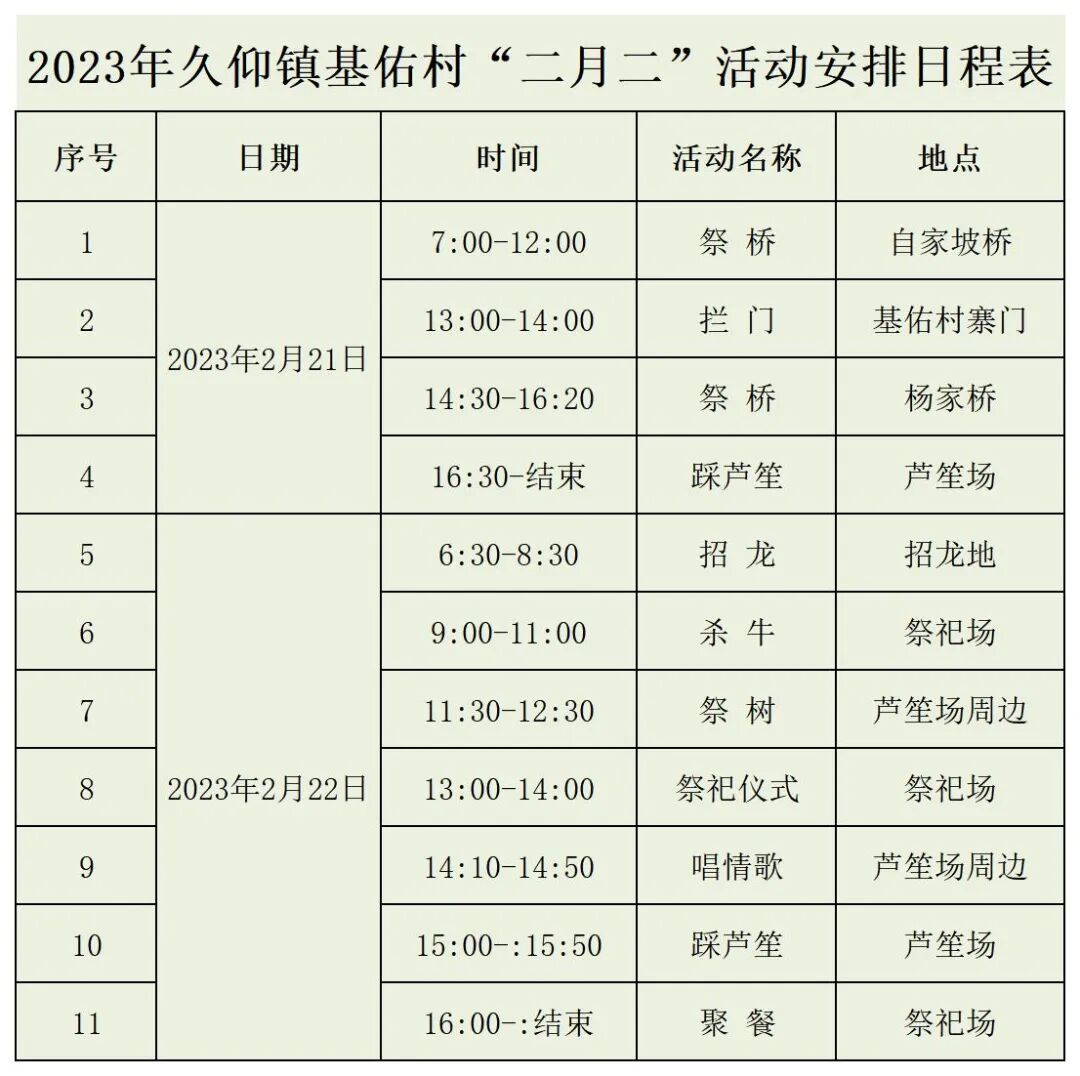 二月二·“祭桥节”民俗活动活动时间:2023年2月21日至2月22日(农历二月初二至初三) 活动地点:剑河县久仰镇基佑村 活动日程: