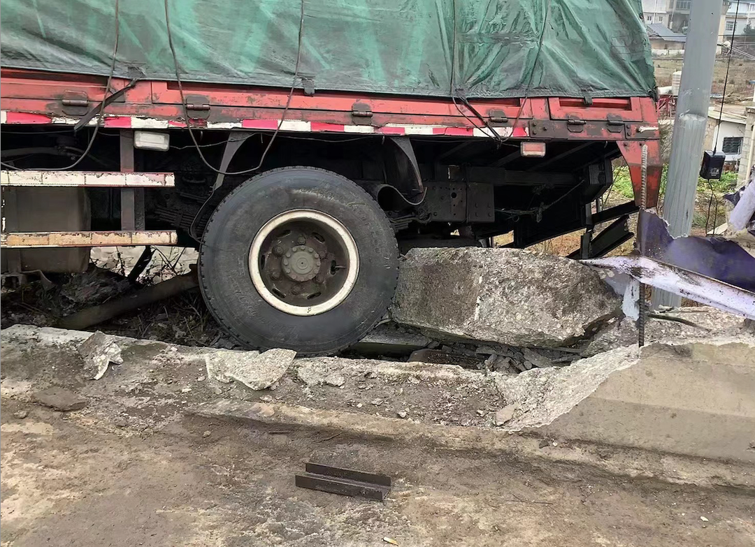 2023年2月20日8时许,毕节市威宁县高速东站闸道出口红绿灯处一辆大货车以较快的速度出现在监控画面中,随后撞上交通信号灯发生侧翻。