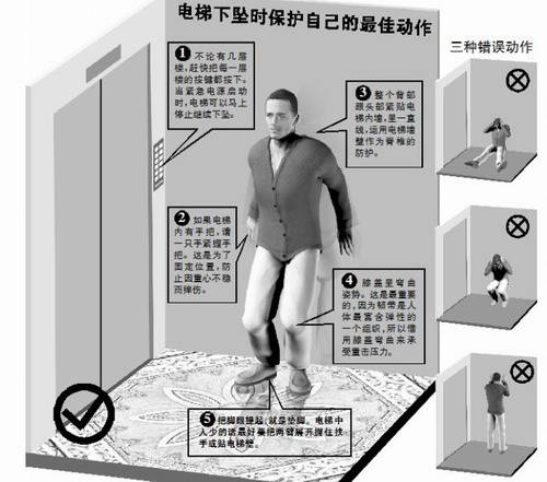 不要来回走动,站稳,双手护颈,整个背部和头部紧贴电梯内壁保护脊椎,同时双腿弯曲、抬起脚跟以减缓冲力。如电梯内有扶手,亦可一手抓扶手固定身体,其余动作同上。