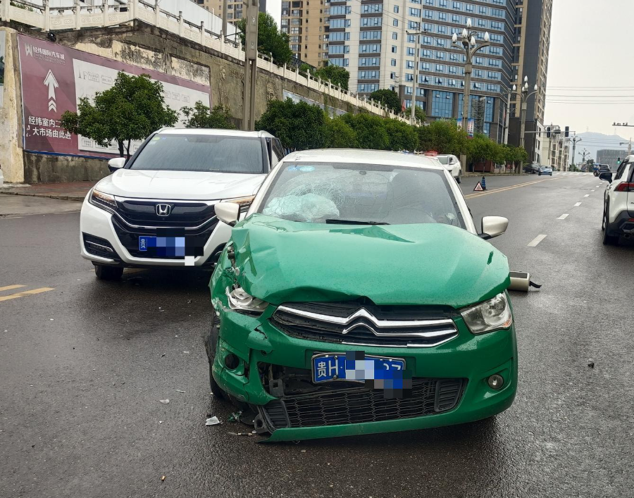案例二 2022年9月11日下午2点56分,黔东南州公安局高新区分局交管大队接到报警,汽车城路段发生一起两车相撞的交通事故,请求出警。 事故地点位于开创北路经纬汽车城二手车市场路段,一辆白色越野车斜停在道路中央,一辆出租车停在其前方,接触点位于越野车左前方与出租车的右后方,越野车左侧及出租车前排座位安全气囊弹出。出租车的两位伤者已送往医院。