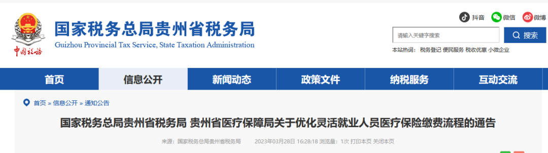 国家税务总局贵州省税务局 贵州省医疗保障局关于优化灵活就业人员 医疗保险缴费流程的通告