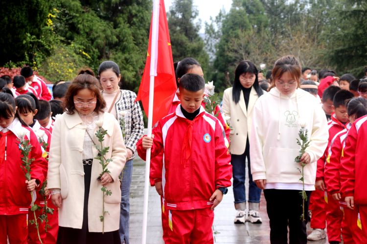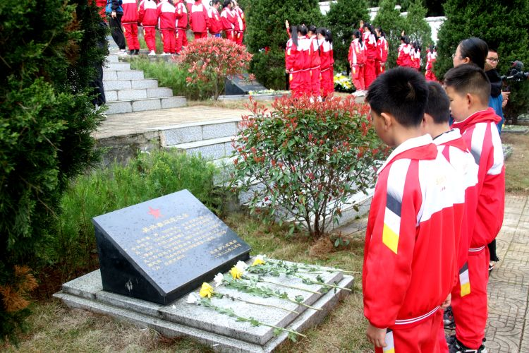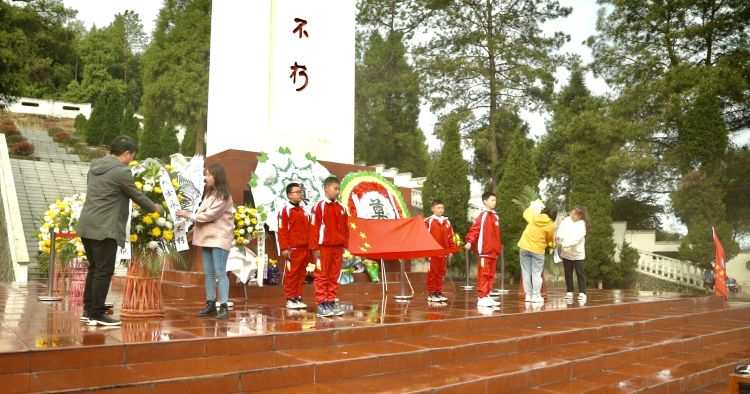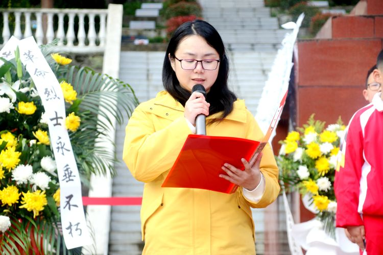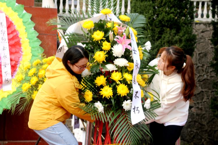 教师代表怀着崇敬的心情,踏着沉重的步伐向烈士敬献花篮、整理挽联、绕碑瞻仰,现场气氛庄严而凝重。