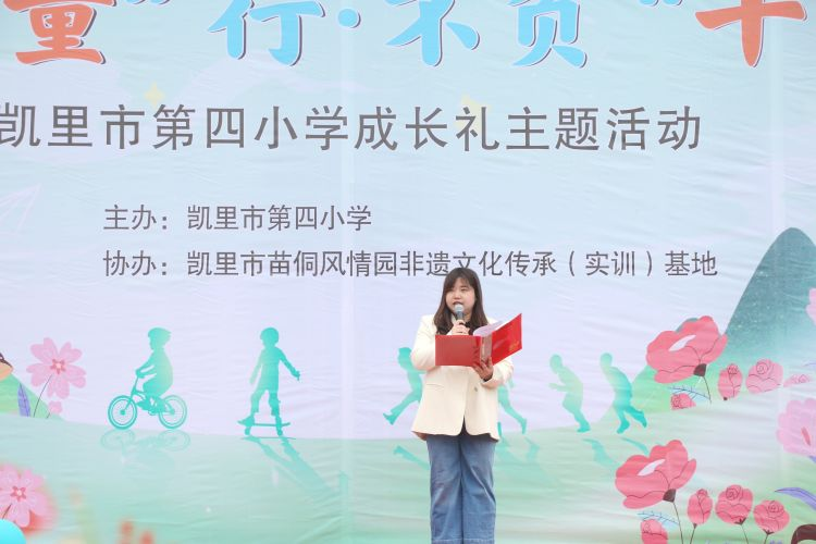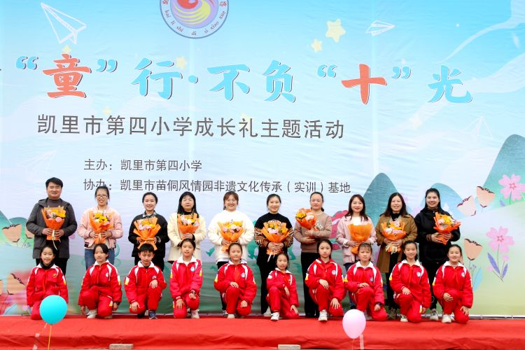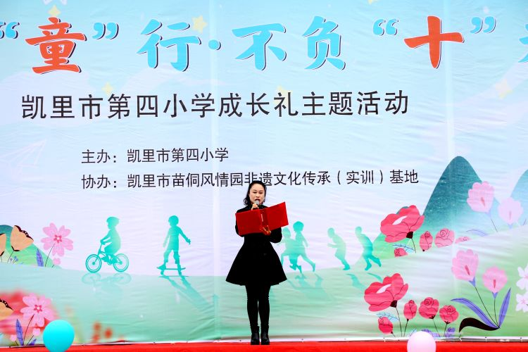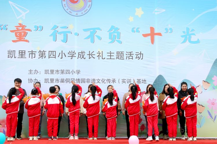 成长礼赞——才艺表演 仪式上,同学们载歌载舞,以多姿多彩的才艺展示来庆祝自己的十岁生日。有甜美轻快的乐曲,有活泼优美的舞蹈,无一不蕴藏着孩子们成长的自信和喜悦。孩子们用自己的表演,传达着对祖国的热爱、对老师最诚挚的敬意,对家长最由衷的感恩。在这个光荣而有意义的时刻,在老师的见证下,孩子们告别十岁,迎接成长。这个庄严、温馨和感人的成长礼,一定会深深地印刻在每个凯里四小学子的记忆里,引导他们在今后的生活、学习中学会自立,懂得感恩,长大后做一个顶天立地的人。今后苗侗风情园非遗研学基地携手各学校将开笔礼、成长礼、毕业季、爱国教育、非遗体验、苗侗药科普、 民俗文化、 自然科普、 历史人文、民族美食、生命安全、学业规划、艺术创鉴等主题与学科教学多元化相融合,引导青少年成长为担当民族复兴大任的时代新人!