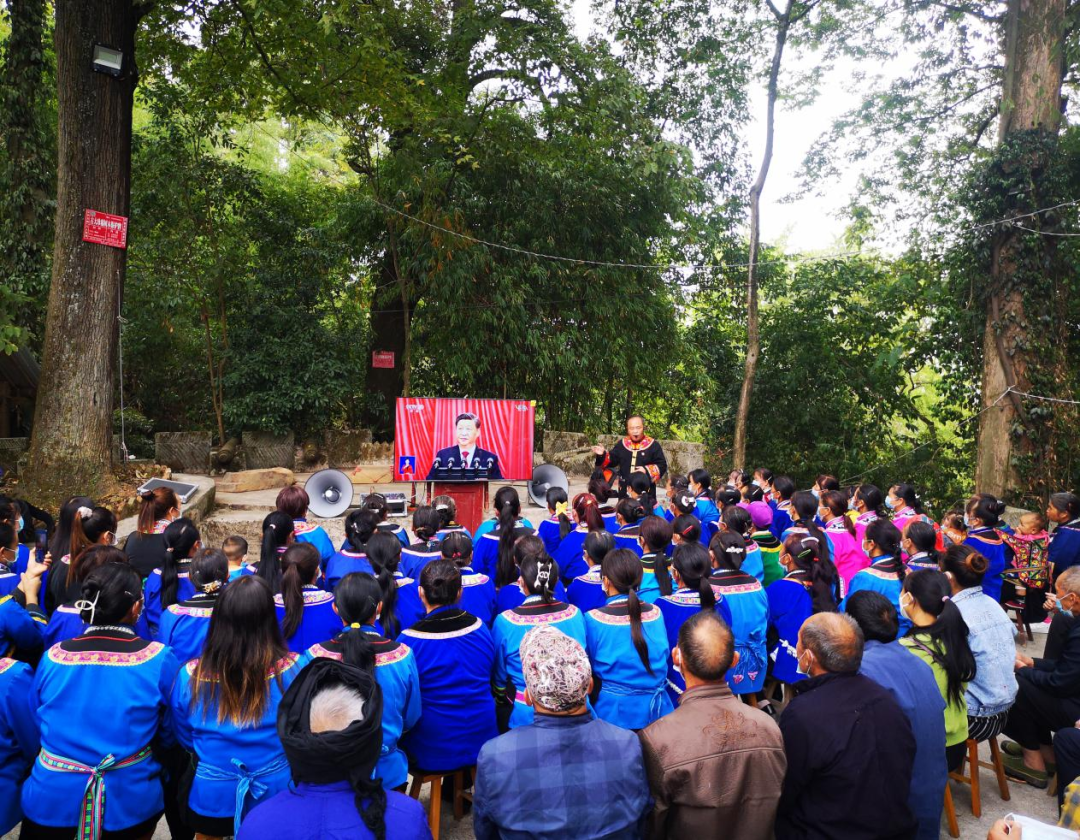 图为:赵华甫在金竹街道仙坝村为畲族群众双语同声传译中国共产党第二十次全国代表大会开幕会