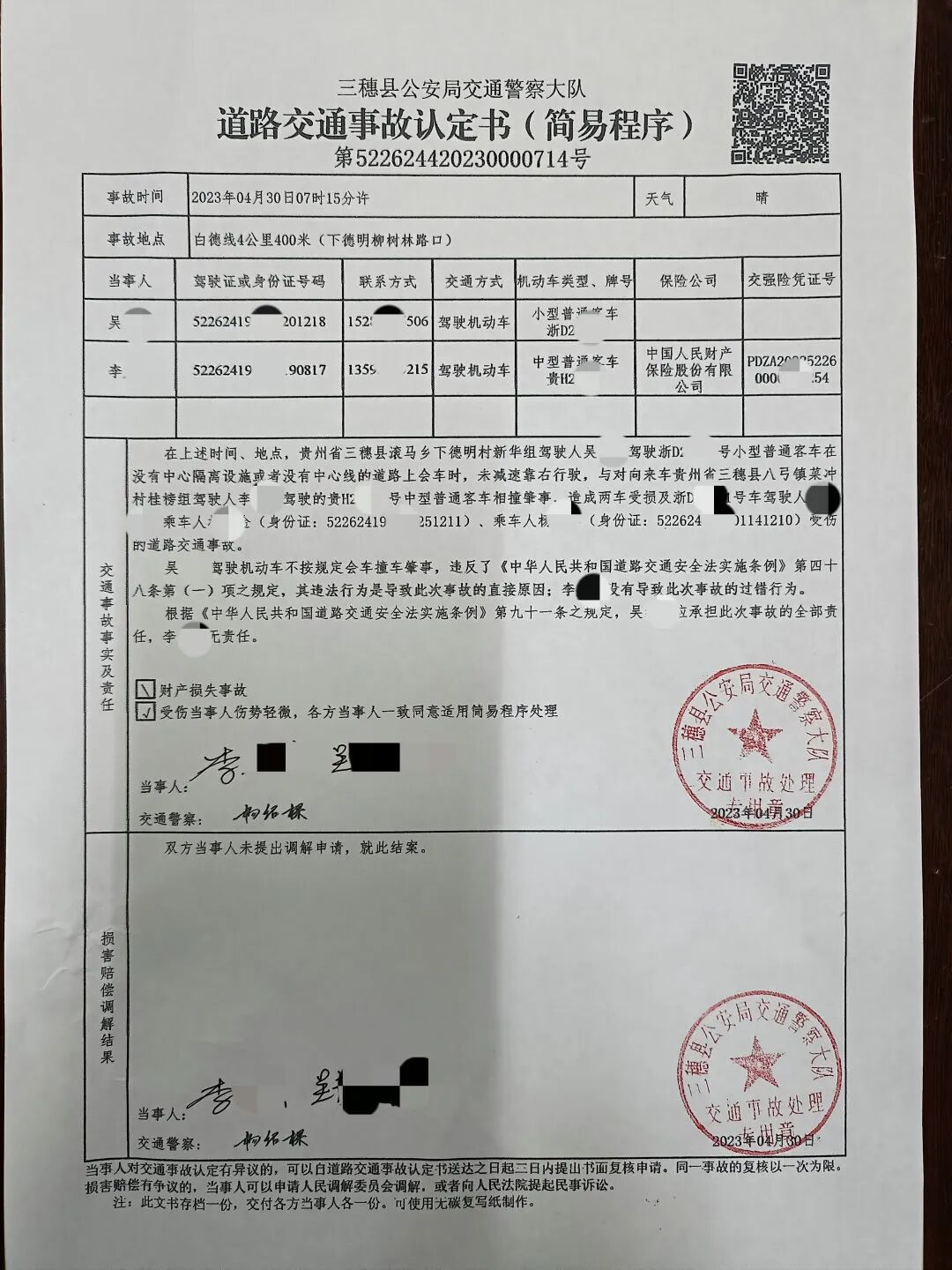 2023年4月30日,在三穗县白德线4公里400米(下德明柳树林路口)处,发生一起小车与中巴车相撞肇事造成两车受损和小车驾驶人及两名乘车人受伤的交通事故。