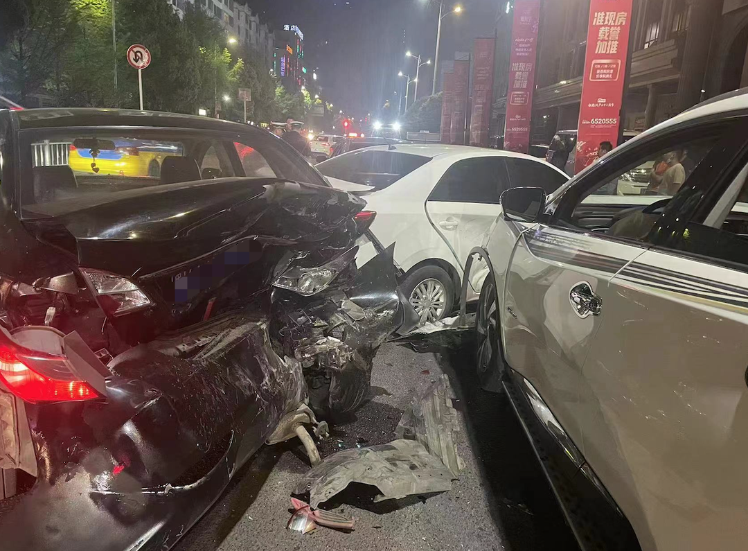 六盘水交警一大队三中队民警抵达事故现场看见,路面上一片狼藉,车辆零件四处散落,民警在确认并无人员受伤后,立即开展调查。