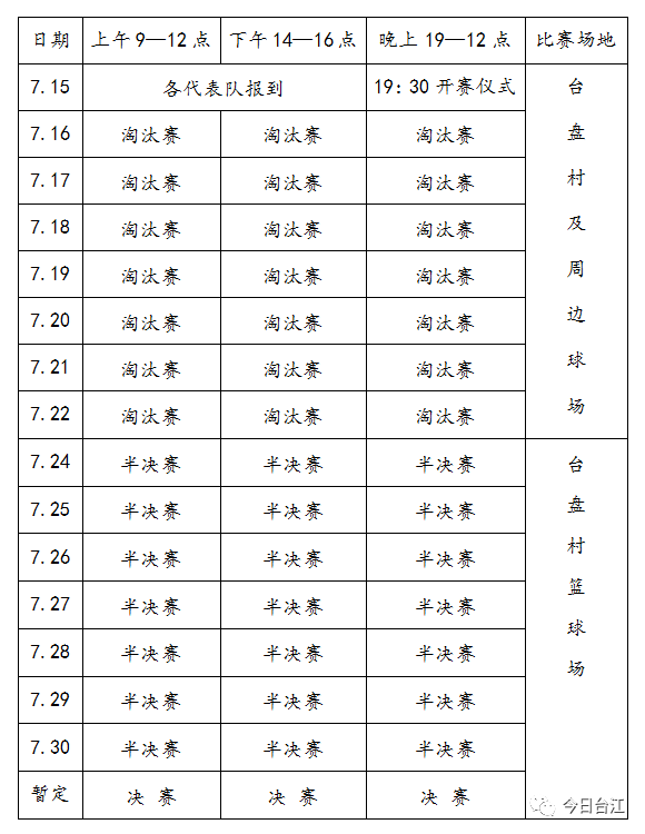 [color=rgba(0, 0, 0, 0.9)]眼下,即将开赛的是 [color=rgba(0, 0, 0, 0.9)]台江县2023年“村BA” [color=rgba(0, 0, 0, 0.9)](台盘村“六月六”) [color=rgba(0, 0, 0, 0.9)]苗族“吃新节”篮球赛 [color=rgba(0, 0, 0, 0.9)]7月15日 [color=rgba(0, 0, 0, 0.9)]台江县台盘乡“村BA”篮球场 [color=rgba(0, 0, 0, 0.9)](根据报名队数情况 [color=rgba(0, 0, 0, 0.9)]淘汰赛将分流到周边球场进行) [color=rgba(0, 0, 0, 0.9)]具体赛事活动日程↓↓↓ [color=rgba(0, 0, 0, 0.9)]  [color=rgba(0, 0, 0, 0.9)]交通 [color=rgba(0, 0, 0, 0.9)]一、台江县城⇌台盘(村BA) [color=rgba(0, 0, 0, 0.9)]选择乘坐台江⇌革一(经台盘)农村公交车往返台盘(村BA), [color=rgba(0, 0, 0, 0.9)]营运时间:7:00--22:00 [color=rgba(0, 0, 0, 0.9)](其中: 7:00--18:00,30分钟1班次,18:00--22:00视客流量情况灵活调剂时间)。 [color=rgba(0, 0, 0, 0.9)]台江县城乘车地点:桃源移民安置点、浙华玉园、御江苑、张家寨路口, [color=rgba(0, 0, 0, 0.9)]台盘乘车地点:台盘交警中队对面停车场。