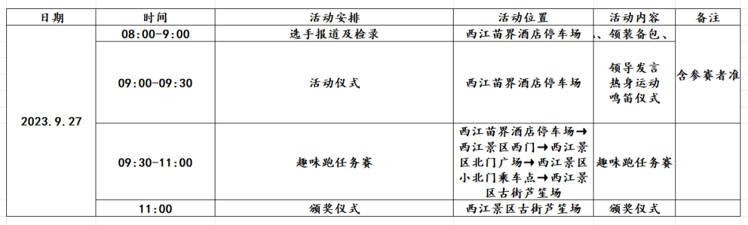 (一)趣味任务赛(300人) 1.开始时间:2023年9月27日09:30 2.关门时间:11:00 3.活动地点:雷山县西江景区 4.活动内容: (1)趣味跑任务赛:约6公里 (2)互动内容: a/拦门酒(甜酒/酸汤) b/打糍粑 c/缘起乡村·情定西江(红鸡蛋) d/扎染 5、活动线路:  路线:西江苗界酒店停车场(起点)→西江景区北门景区检票口→小北门乘车点→古街芦笙场(终点) 6、有效成绩说明: (1)需要完成至少三个体验项目; (2)折返点的任务为必做项,未完成则赛事成绩无效。 (3)完成上述任务由工作人员检查合格,并跑回终点有计时成绩的参赛人员,计入有效参赛成绩。 03报名须知