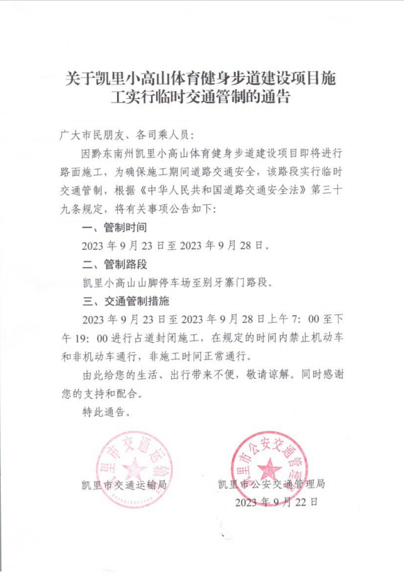 [【微信新闻】] 关于凯里小高山体育健身步道建设项目施工实行临时交通管制的通告 |