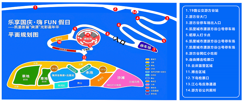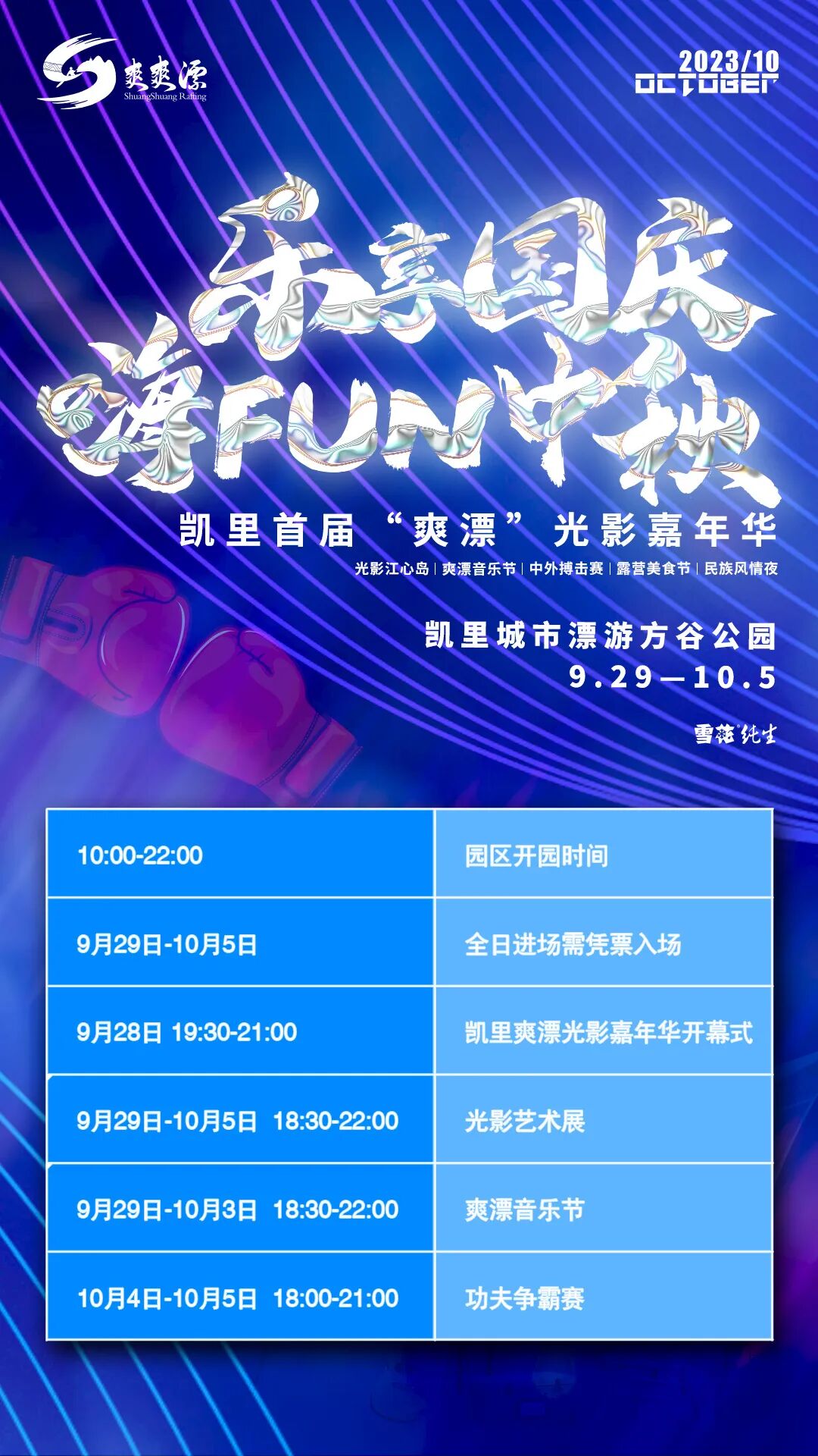 由贵州爽爽漂流旅游服务有限公司、贵州新辰文化旅游开发运营公司主办,贵州爽爽漂流清水江旅游有限公司、贵州擎天宝玉会务服务有限公司承办的“乐享国庆·嗨FUN中秋”—凯里首届“爽漂”光影嘉年华将于2023年9月29日至10月5日在凯里城市漂游方谷公园盛大举行。 去看山、去玩水、去露营、去放飞? 这些都有! 活动期间玩法多样,超多体验项目