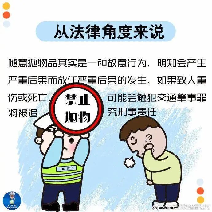当后车发现前车抛物时,后车驾驶人会受惊或为躲避垃圾紧急换道从而发生道路事故。前面车子突然扔出矿泉水瓶等硬质垃圾时,极有可能因风速和加速度等原因直接撞击后车,如砸到后车挡风玻璃,这时这些垃圾就可能变成一个“炸弹”。