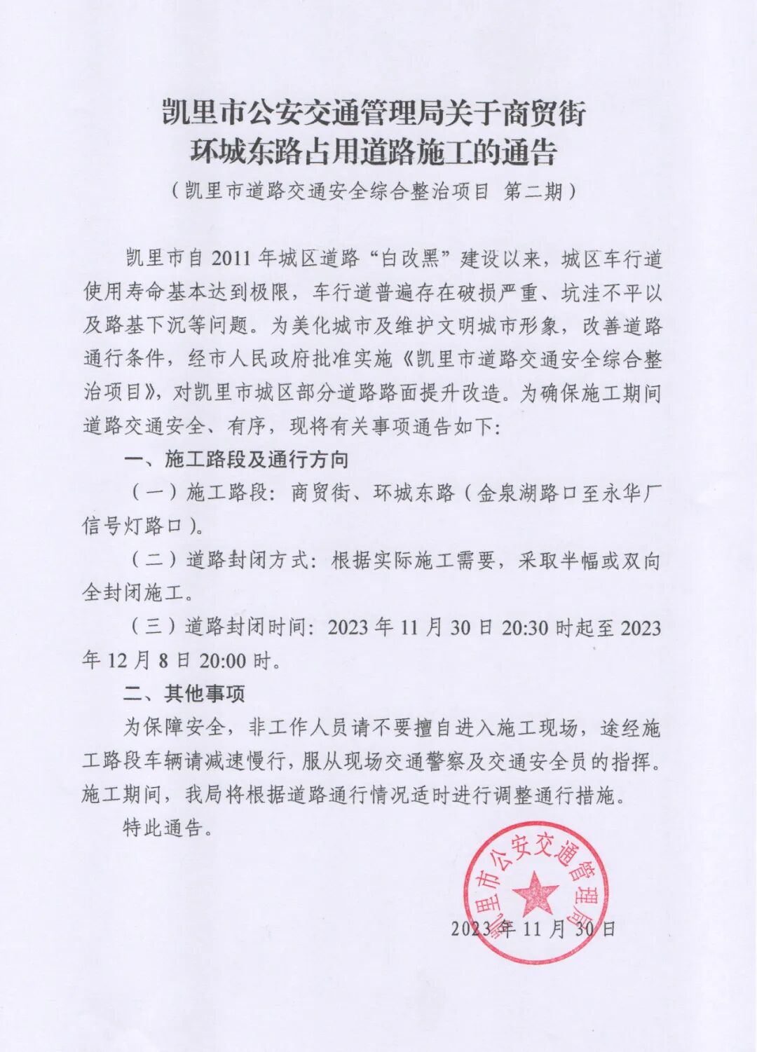 [【微信新闻】] 凯里市公安交通管理局关于 商贸街 环城东路 占用道路施工的通告 |