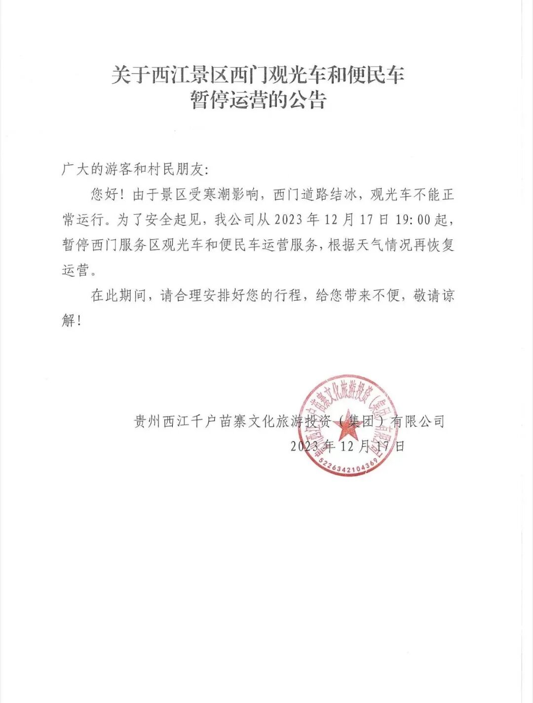 [【微信新闻】] 关于西江景区西门观光车和便民车暂停运营的公告