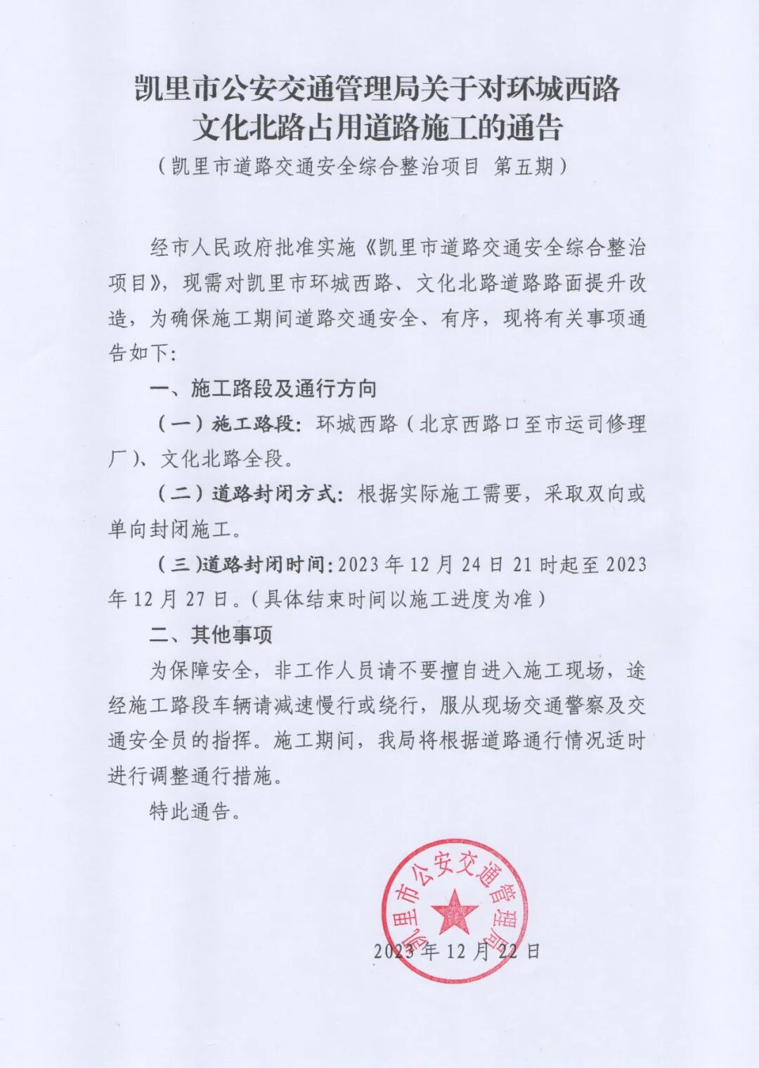 [【微信新闻】] 凯里市公安交通管理局关于对环城西路文化北路占用道路施工的通告 |