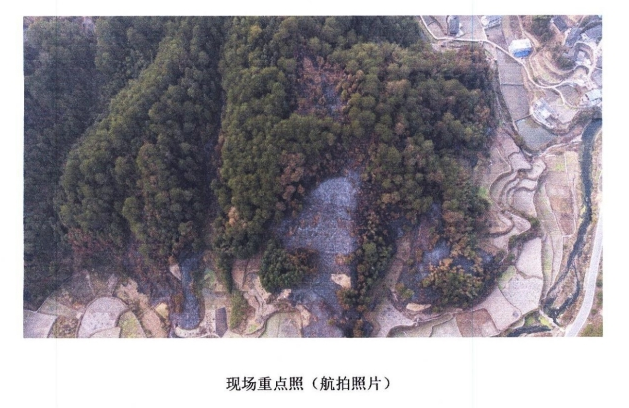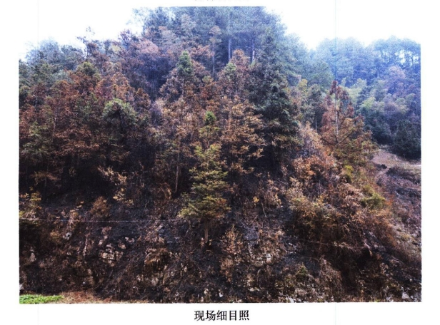 火灾过后,原本茂密、翠绿的山林不再完整,山顶中间被烧焦了一大块,22.0344公顷林地过火,全部为乔木林地,一般商品林7.1794公顷、重点公益林14.8550公顷。被烧过的地方焦黑一片,光秃秃的。
