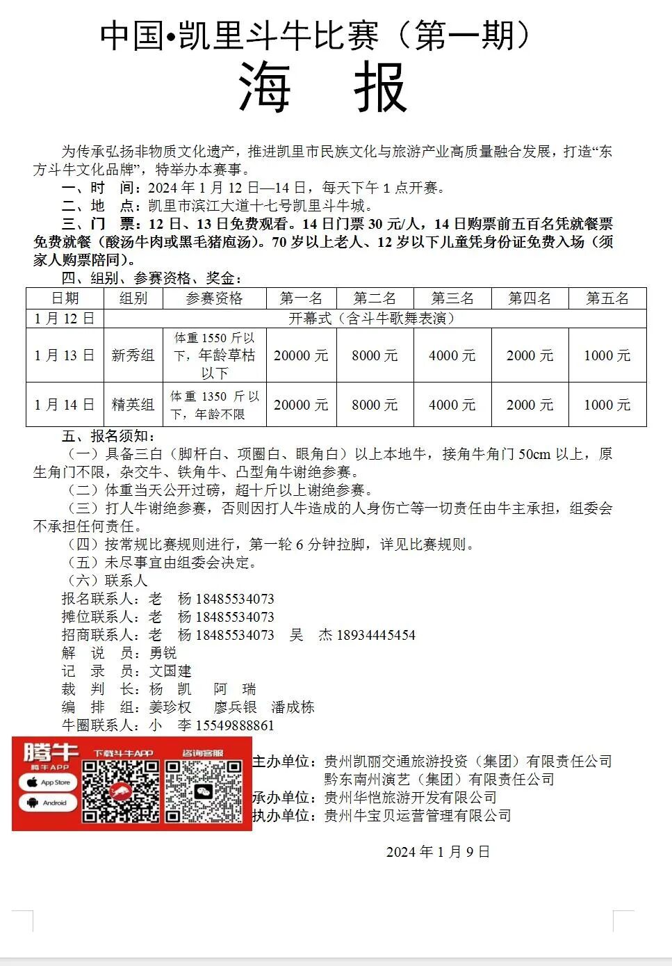 凯里市苗族斗牛习俗2009年9月被列为省级非物质文化遗产,为推进民族文化与旅游产业高质量融合发展,由贵州凯丽交通旅游投资(集团)有限责任公司和黔东南州演艺(集团)有限责任公司主办,贵州华恺旅游开发有限公司承办,贵州牛宝贝运营管理有限公司执办的“中国·凯里斗牛表演赛” 开幕式将于2024年1月12日3点在凯里斗牛城隆重举办,13日-14日下午1点正式举办第一期斗牛比赛。