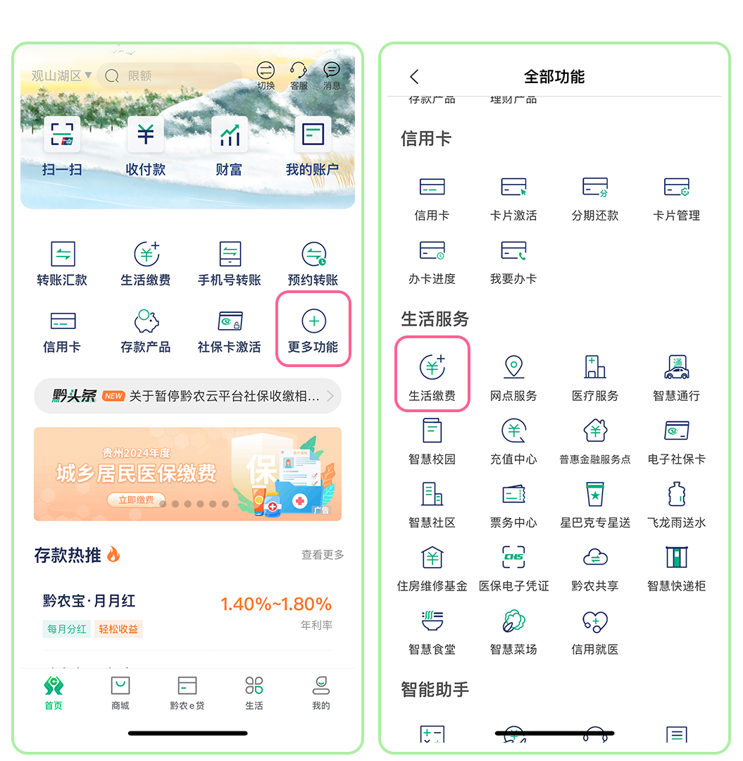 - THREE -  缴费方式  黔农云线上缴费 步骤一:打开并登录黔农云APP,点击“更多功能”,选择“生活缴费”(或直接点击首页“生活缴费”)  步骤二:点击“医疗保险”,个人缴费选择“个人医疗保险缴纳”,他人代缴选择“代缴医疗保险”  步骤三:输入参保人个人相关信息后,点击“查询”,核对相关信息无误后,点击“查询”  步骤四:选择参保地区征收机关后,点击“确定”,缴费成功   微信线上缴费 即日起至2024年2月29日活动期间 ,用户通过微信缴纳 2024 年度城乡居民基本医疗保险,并选择绑定的贵州农信社保卡进行支付,可享受随机立减优惠,有机会立减30 元,活动期间同一用户可享受 1次优惠,用完即止。  黔农村村通线下缴费 针对部分年龄较大、行动不便、不会使用手机的老百姓,可以持参保人有效身份证件(身份证、户口本等)就近到贵州农信在各乡镇、各村(居)的商店、超市、卫生室、党群服务中心等地点部署的黔农村村通、黔农驿站普惠金融服务点进行医保缴费,既省时省力,又安全快捷。   营业网点柜面线下缴费 客户还可持参保人有效身份证件(身份证、户口本等)到贵州农信各营业网点进行缴费。