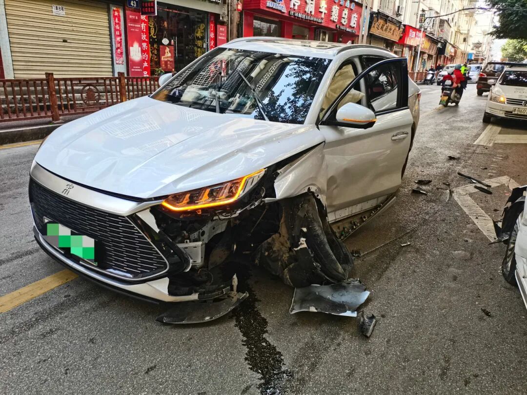 经民警调取周边监控视频后了解,当时小型轿车行驶在主干道上,新能源汽车驾驶人在行驶过程中变道超车,突然从左侧变道至小型轿车主干道,碰撞到正常行驶在道路上的小型轿车肇事。所幸,此起事故双方驾驶员都系好了安全带只受一点轻伤。