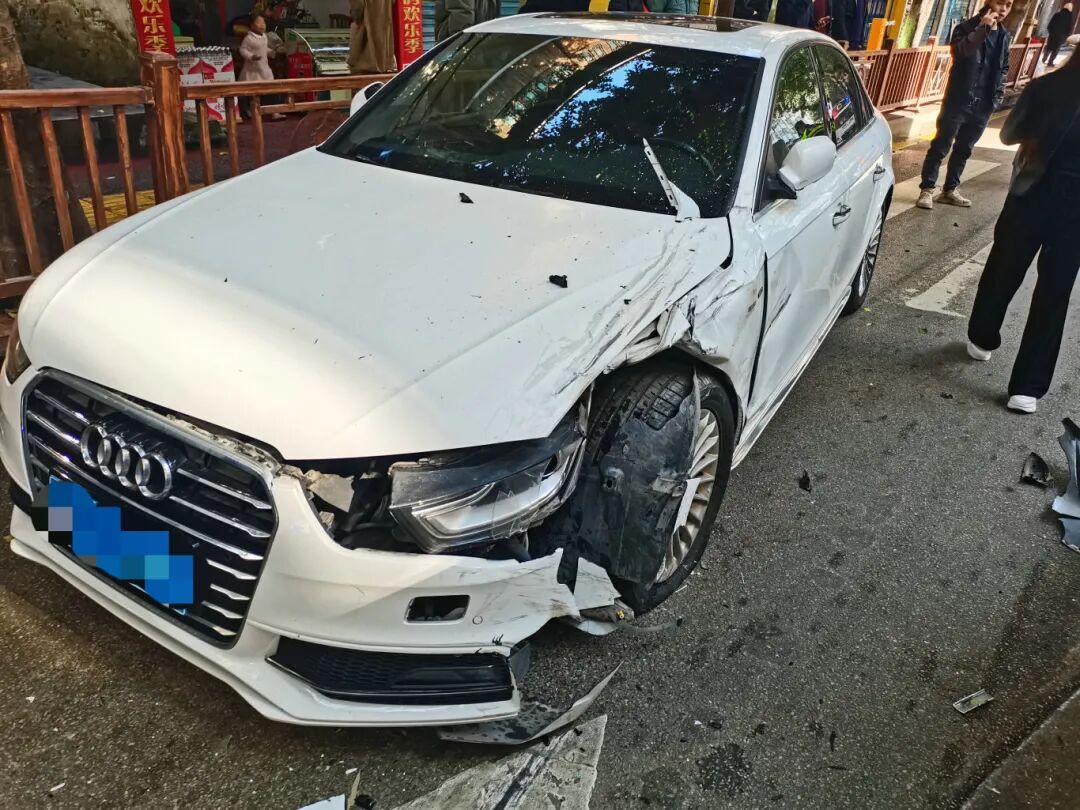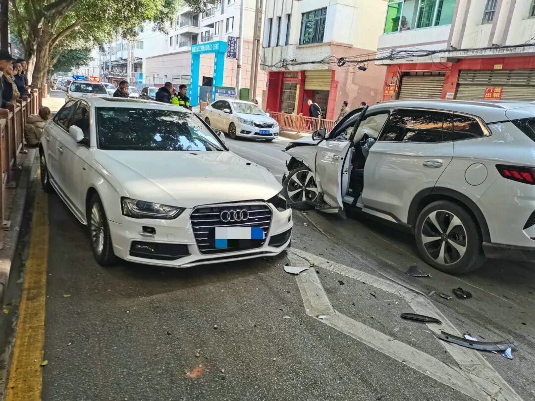 接警后,从江县公安局交警大队民警立即赶往现场,到现场后发现,是一辆新能源白色越野车与一辆小型轿车发生碰撞肇事,了解情况后,民警随即对事故现场进行了调查取证。    事故现场↑↑↑