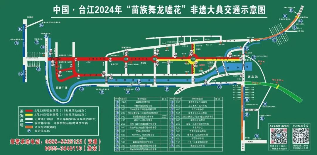 2024年2月23日至24日,中国·台江2024年“苗族舞龙嘘花”系列活动在我县隆重举行,届时将吸引数以万计的群众前来观看。本着“精心组织、周密安排、热情服务、安全畅通”的原则,经请示县人民政府同意,根据《中华人民共和国道路交通安全法》相关规定,活动期间,将对城区部分道路分时、分段采取临时交通管控措施,现将有关事宜公告如下: