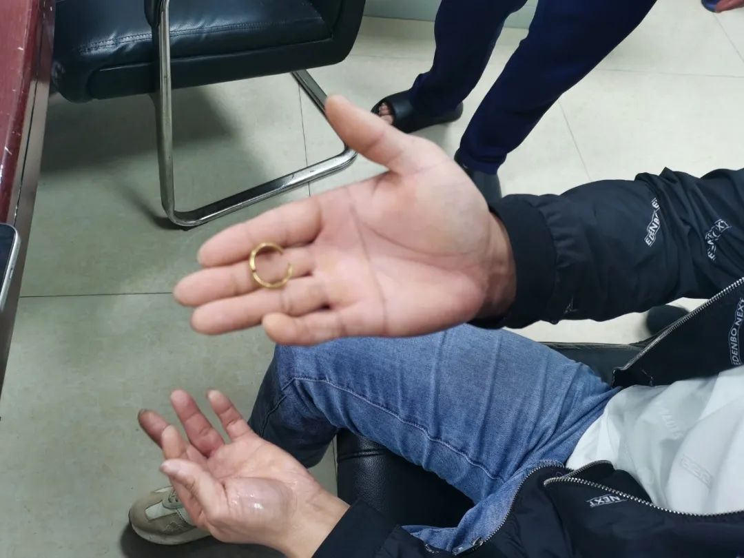 3月22日晚00时24分,一男子走进天柱县擎天路消防救援站寻求帮助,其手指被戒指卡住,在家自己尝试用肥皂水、食用油等方法还是无效后,自行来到了天柱县擎天路消防救援站求救。救援人员见状先是将垫片塞入被困人手指与戒指中间,利用戒指切割器上的砂轮锯对戒指进行切割,其次对切割部位进行洒水降温,防止高温烫伤被困人手指。经过近10分钟救援,戒指被锯开豁口,救援人员迅速拿出老虎钳,通过锯开的小豁口向两边扩张,随着“啪”的一声响,戒指应声而落。