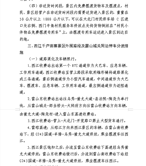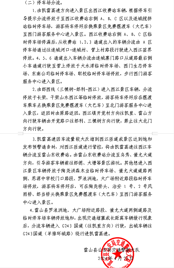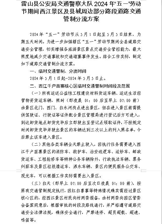 [【微信新闻】] 2024 年“五一”西江景区及县城周边部分路段交通管制分流部署 |
