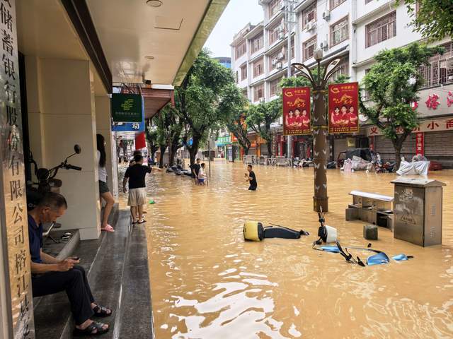 6月24日凌晨,受持续强降雨及上游来水叠加影响,榕江县境内的寨蒿河、都柳江等河流水位暴涨,出现5100立方米/秒的洪峰流量,形成30年一遇的特大洪灾,沿江地区遭受严重冲击,榕江县城多处低洼地带被淹,全县受灾严重。  (图为洪水位持续上升,邮储银行榕江县支行干部员工积极协助群众转移)