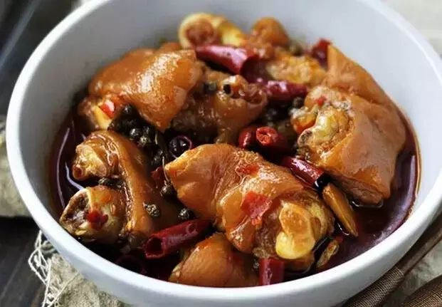 1麻辣猪蹄 材料 猪前蹄 ,红干椒,植物油,精盐,麻椒 豆瓣酱,生姜,桂皮,八角香叶 做法 1、用刀子把猪蹄刮剃干净,自骨缝处下刀,斩成大段。