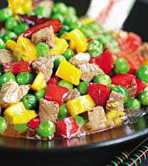 五彩牛肉粒 原料:牛里脊200克、豌豆200克、红椒半个、黄椒半个、姜2片、干辣椒数个 调料:香蒜辣椒酱2汤匙(30ml)、料酒1茶匙(5ml)、生抽1茶匙(5ml)、干淀粉1茶匙(5克)、蚝油2汤匙(30ml)、盐1/2茶匙(3克) 做法: 1)牛里脊切成5mm见方的小丁,放入碗中,倒入料酒、酱油、香蒜辣酱和干淀粉抓匀,腌制10分钟。 2)豌豆去皮洗净(或用冷冻豌豆),放入沸水中烫熟,捞出后沥干备用。红、黄椒切成5mm见方的小丁。 3)炒锅中倒入油,待7成热时,放入干辣椒和姜片爆香,然后放入牛肉粒翻炒2分钟,脱生后倒入豌豆和红黄椒丁,再调入蚝油和盐,翻炒几下即可出锅。