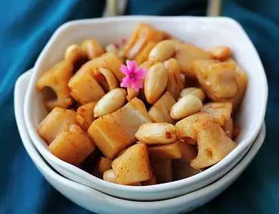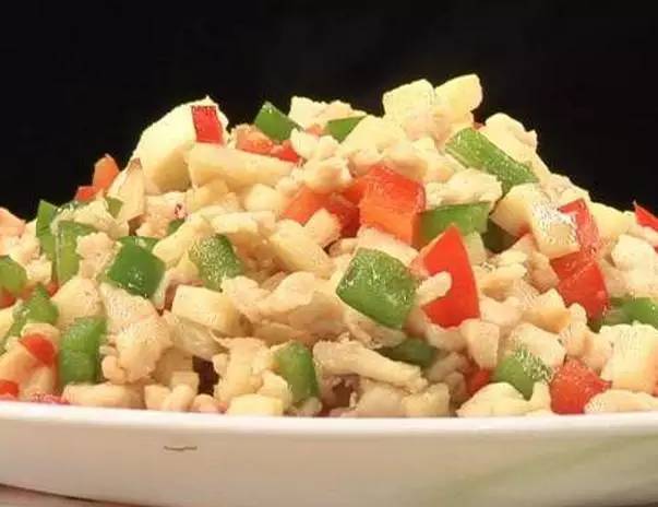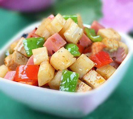 辣炒什锦藕丁 制作方法: 主料: 莲藕火腿青椒 豆干 辅料: 老干妈辣酱 酱油 盐 原料:莲藕1节 火腿100克 青红椒各1根 豆腐干4块调料:老干妈辣酱2汤匙(30ml)酱油1汤匙(15ml)盐1/2茶匙(3克) 做法: 1)青红椒去蒂去籽洗净后切成丁。火腿切丁。豆腐干切丁。莲藕去皮洗净后切丁。 2)炒锅烧热后倒入油,待油7成热时,倒入豆腐丁用大火煸炒1分钟,至豆腐丁表面成微黄色。倒入莲藕丁翻炒2分钟。 3)调入老干妈辣酱,酱油和盐翻炒均匀后,倒入火腿丁,青红椒丁,再继续翻炒1分钟即可。