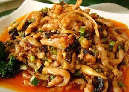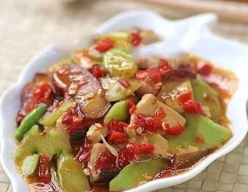 鱼香茄子煲 原料:茄瓜500克,鸡粒100克,炸香咸鱼茸10克,煲仔酱30克,西芹菜粒50克,青、红椒粒20克,上汤1杯,绍酒、蒜茸、葱花、深色酱油、香油各适量。 做法: 1、选长身茄瓜批去皮,去掉头、尾,一开为4件,长约12厘米。 2、烧热锅,下油,烧至约六成滚,投入茄瓜条炸约1分钟至熟,倒起滤去油分。 3、趁锅内余油,下蒜茸、芹菜粒、椒粒、堡仔酱爆香,接着下鸡粒炒匀,加入绍酒、上汤及茄瓜条和以上味料和炸香咸鱼茸,略焖片刻,调入少许生粉,加入包尾油。转盛入瓦煲里,加热至滚,下香油、葱花,加盖上桌即可。 仔姜炒肉丝 主 料:鲜猪肉二两,仔姜二两,青红椒各一只,大葱取葱白二寸一段 调 料:色拉油、黄酒、盐、醋 烹饪过程: 1、猪肉、仔姜、青红椒(去芯)、葱白俱切丝; 2、猪肉略用黄酒、盐腌片刻; 3、油烧到八成热,下姜丝煸香; 4、把肉丝、辣椒丝、葱丝一齐倒入,煸炒,放少许黄酒、盐,起锅时滴点醋。 备注:此菜色泽淡雅,虽不加芡,也有透明薄汁,不放味精,自然鲜美。由于大火炒成,吃口很嫩,仔姜、辣椒、葱白脆肥,肉丝融入仔姜味,格外诱人。 腊肉烩豆腐 原料:腊肉1块 北豆腐1盒 香葱2根 蚝油2汤匙(30ml) 白糖1茶匙(5克) 盐1/4茶匙(1克) 白胡椒粉1/2茶匙(3克)水淀粉2汤匙(30ml) 做法: 1)腊肉放入冷水锅中,以大火煮10分钟,捞出稍冷却后,切片备用。豆腐切2cm大的小块,放入煎锅中,用中火双面煎成金黄色。青葱洗净切成段。 2)煎锅中倒入少许油,大火加热至7成热时,放入香葱爆香,然后倒入腊肉,豆腐,调入蚝油,白糖,盐和胡椒粉翻炒均匀后,倒入水(没过食材一半即可)盖上锅盖,用中火炖5分钟,带开盖子,淋入水淀粉搅均即可。 超级啰嗦:将腊肉提前在水中煮10分钟,即可以去除咸味,炒制过后口感又可以保持软嫩一些。腊肉和蚝油都有一定的咸度,因此请记得酌量放盐哦。