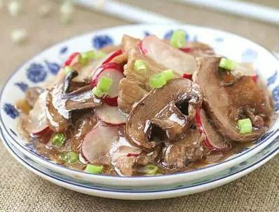 蘑菇五花肉烧萝卜 制作方法: 主料: 口蘑 猪肉 樱桃萝卜 辅料: 老姜大葱 原料:蘑菇片20克 五花肉300克 小萝卜300克 老姜5片 大葱7片 调料:料酒1茶匙(5ml)酱油1汤匙(15ml)蚝油1汤匙(15ml)盐1/2 茶匙(3克)糖1茶匙(5克)白胡椒1/4茶匙(1克)鸡粉1/4茶匙(1克)香油1/4茶匙(1ml) 做法: 1)蘑菇片用冷水浸泡30分钟后洗净。浸泡蘑菇的水过滤掉杂质留用。五花肉切薄片,大葱切片,老姜切片。小萝卜洗净后,切成片。 2)锅中倒入油,大火加热至7成热时,倒入五花肉改中火煸炒5分钟,待五花肉出油后,倒入小萝卜片,姜片和葱片,继续煸炒3分钟至水分出来。 3)调入酱油,蚝油,盐,糖和白胡椒粉,倒入蘑菇片和少许浸泡蘑菇的汤(没过锅内食物一半位置即可),盖上锅盖用中火焖5分钟,打开盖子后,改成大火,将汤汁收到略干,调入鸡粉和香油即可出锅